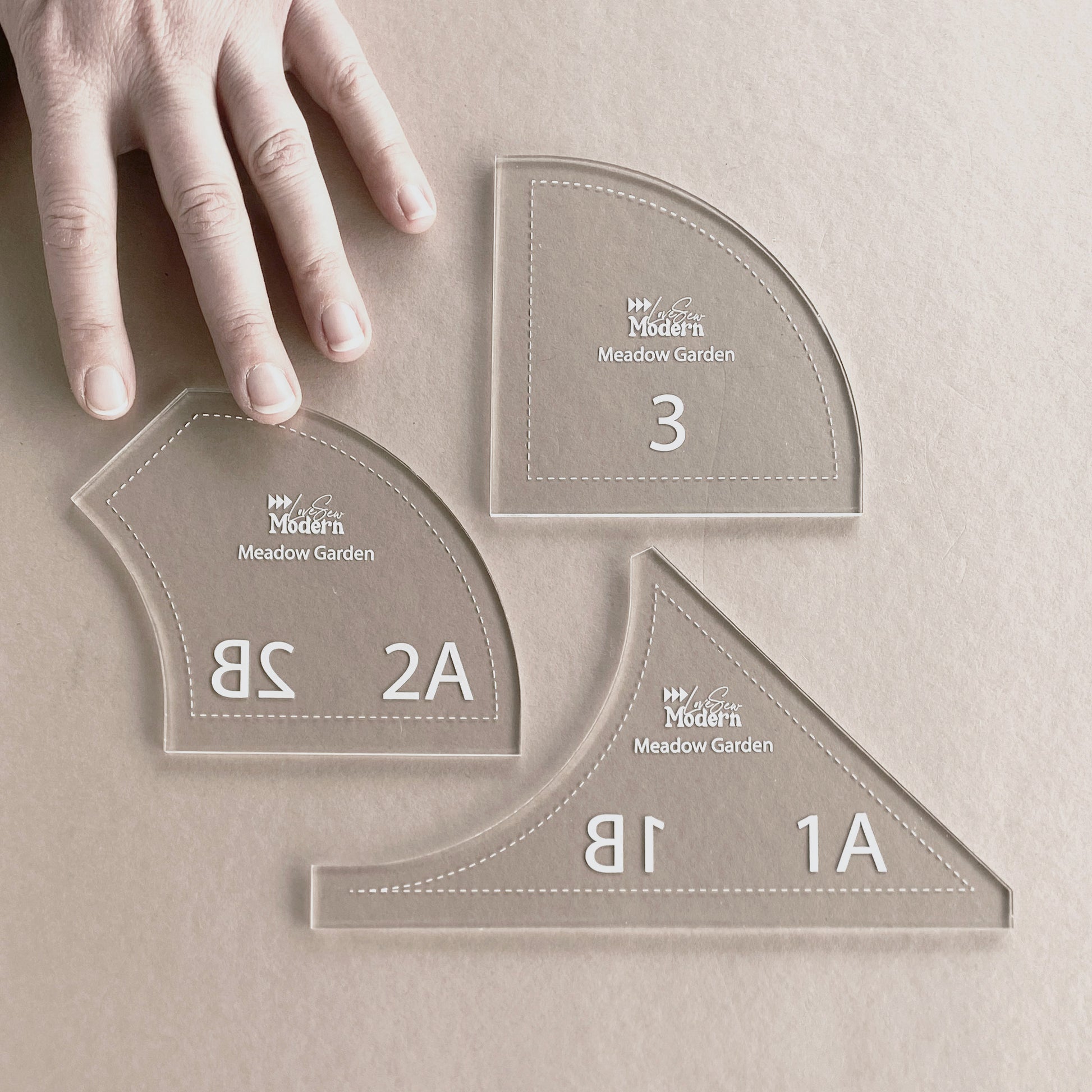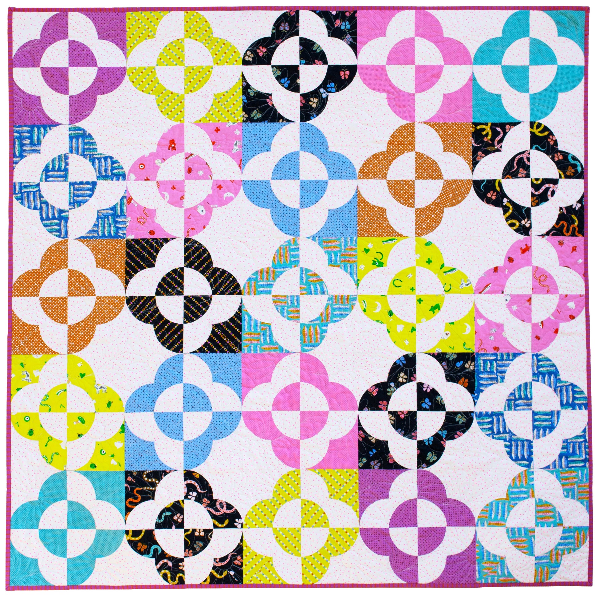 Meadow Garden is a traditionally pieced, block-based quilt pattern that uses fat quarters. The design is an abstract flower, which creates a secondary design. The pattern includes instructions to make 4 sizes: baby (36 1/2” square), small throw (60 1/2” square), large throw (72 1/2” square), and bed (108 1/2” square).