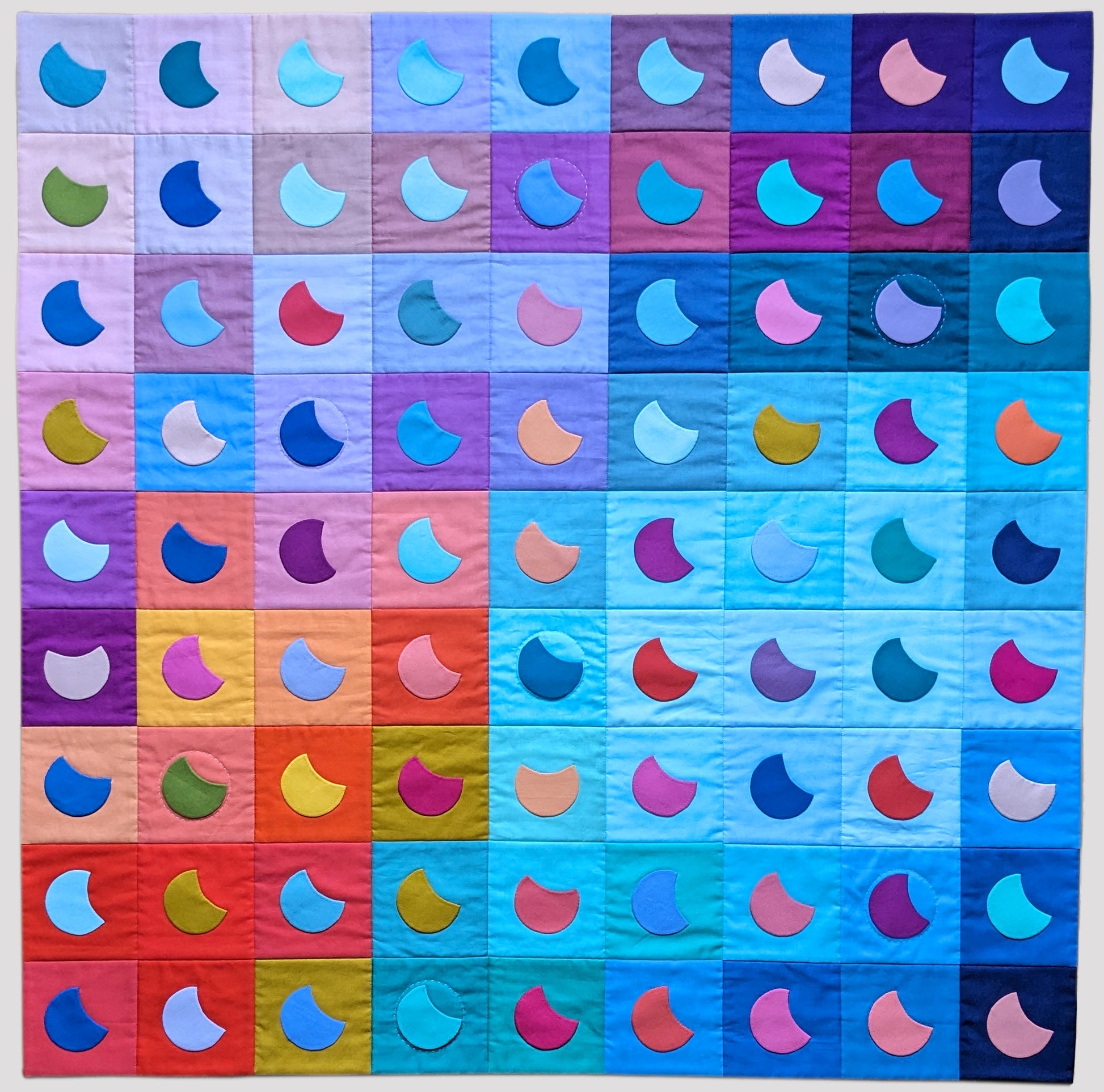 The Moon Pie, Mood Ring Quilt, created by Laura Henneberry Quilts & Design, showcases a dynamic array of two-tone blocks that, when assembled, form a vibrant, technicolor display.