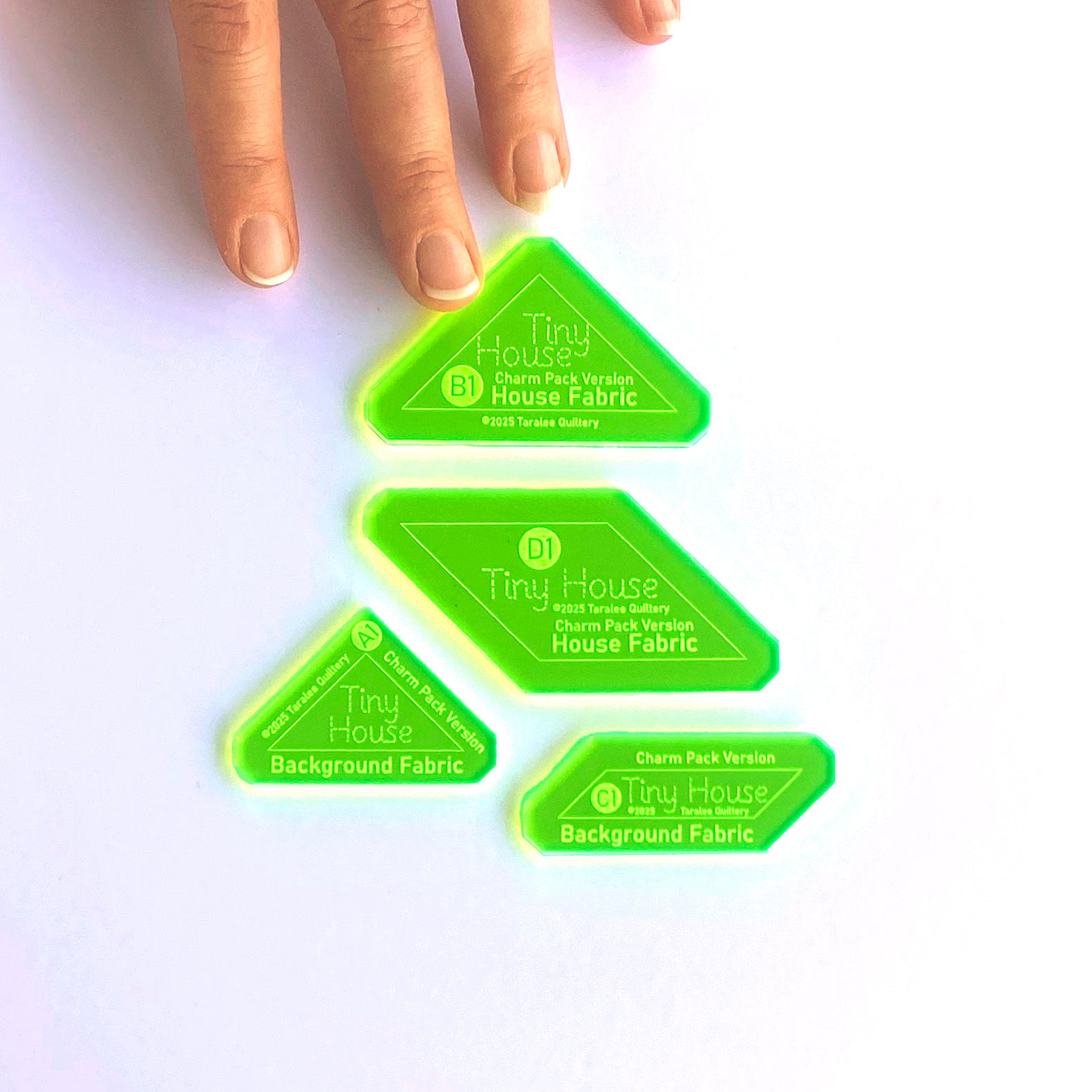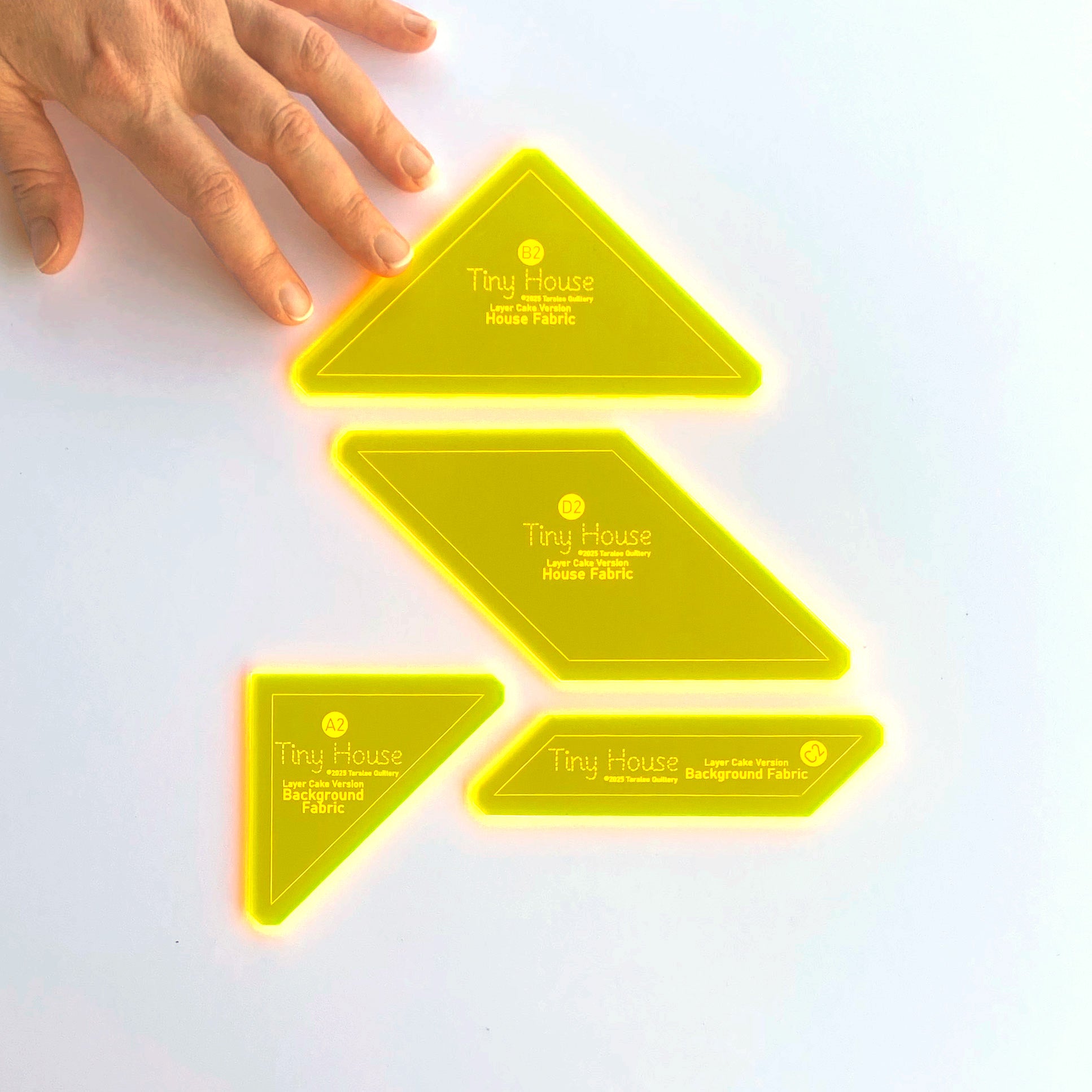 The charm pack templates are laser cut from fluorescent yellow acrylic, and the layer cake templates are laser cut from fluorescent green acrylic.